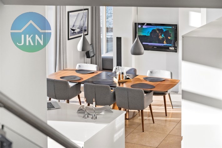 - PARTER: duża i jasna kuchnia z jadalnią i z salonem o powierzchni ok. 24 m2 z wyjściem na taras, główna sypialnia z garderobą i prywatną łazienką z której mamy dostęp do strefy SPA na tarasie, przedpokój