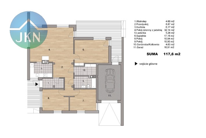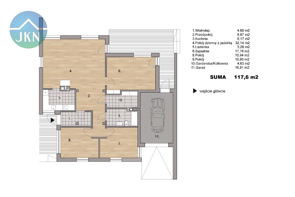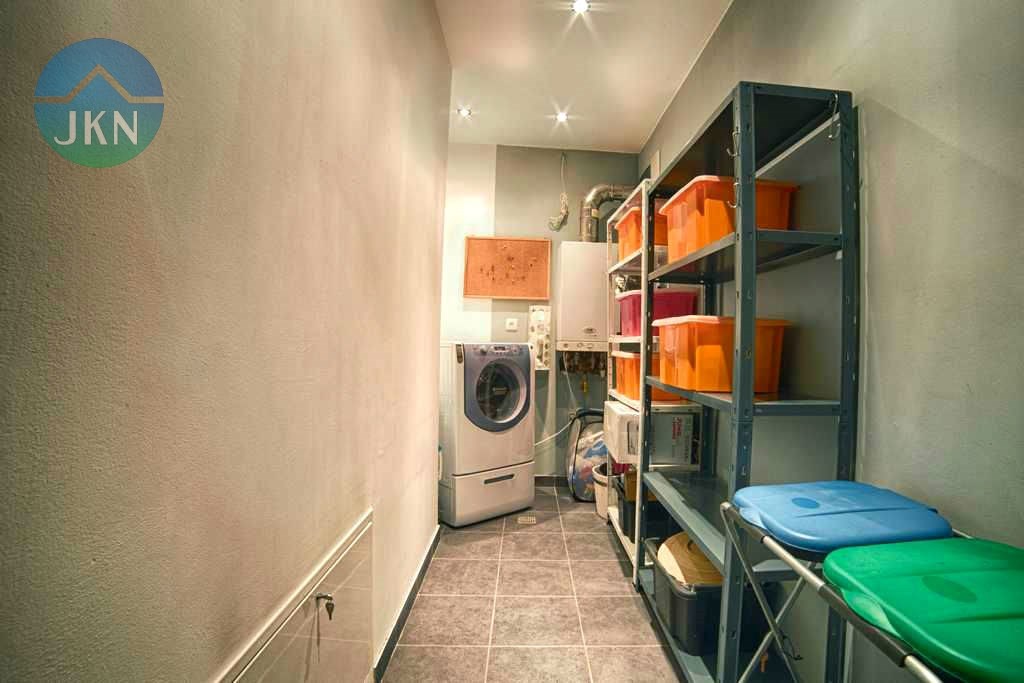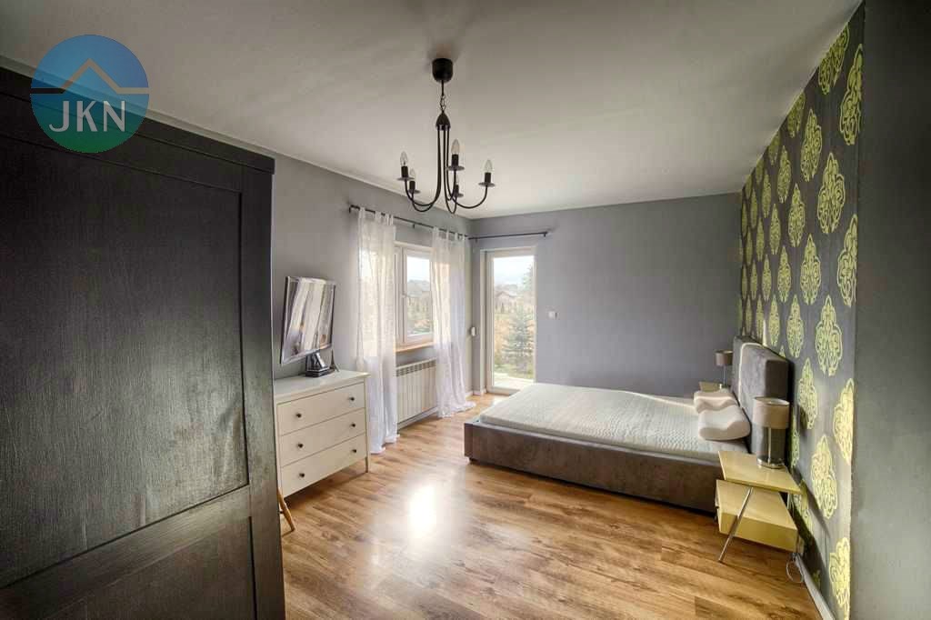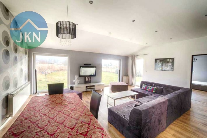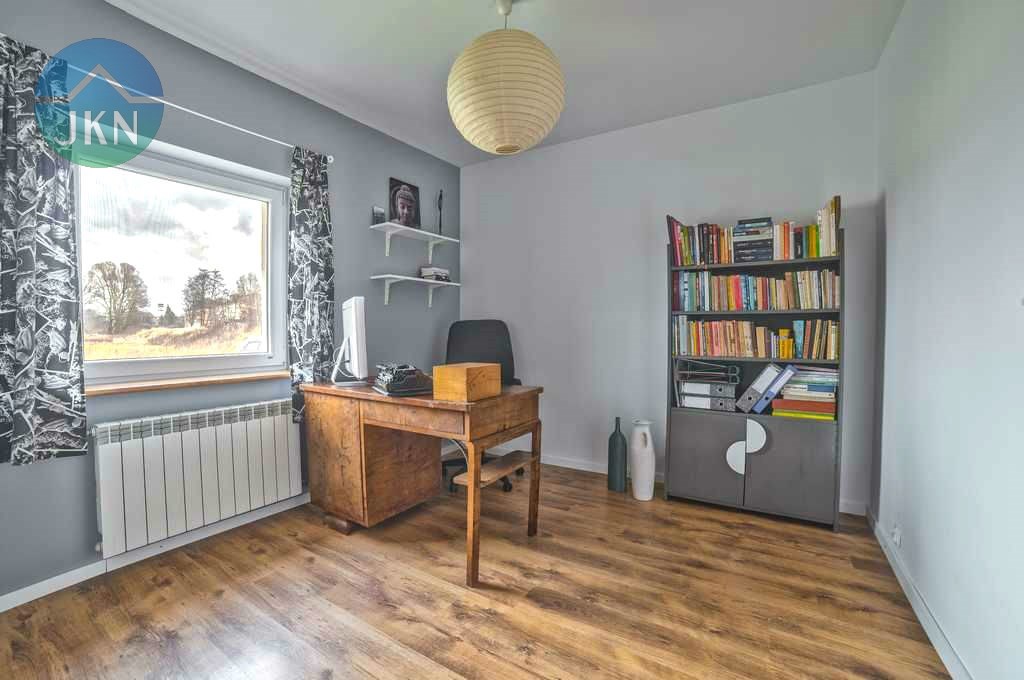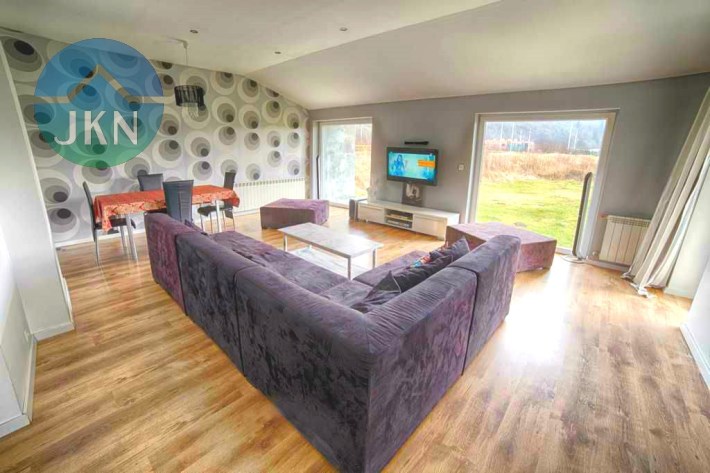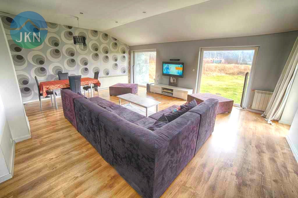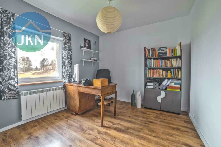 Budynek jest parterowy, z bardzo funkcjonalnym wnętrzem składającym się z dużego salonu z wyjściem do ogrodu, świetnie urządzonej kuchni, przestronnej sypialni oraz 2 pokoi, mogących pełnić rolę gabinetu i/lub pokoju dla dziecka, a także pięknie wykończonej i praktycznej łazienki.