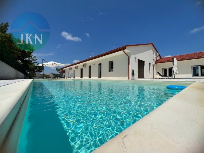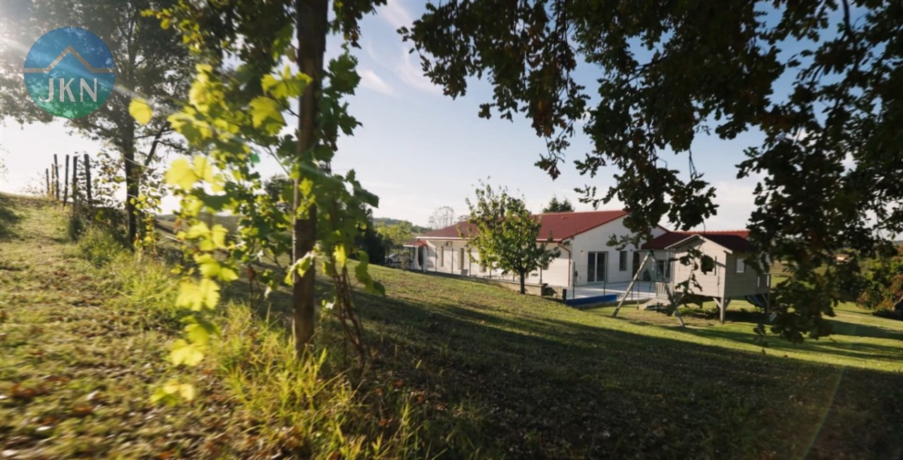 Zewnętrzna część nieruchomości zachwyca: przestronny zadaszony taras z jadalnią, sofami, hamakiem, huśtawką i miejscem do wypoczynku to idealne miejsce na letnie wieczory. Do dyspozycji jest także ogród z grillem, miejsce na palenisko oraz plac zabaw dla dzieci z drewnianym domkiem, huśtawkami i zjeżdżalniami. Główną atrakcją jest prywatny basen o wymiarach 5x12 m z funkcją jacuzzi, otoczony zielenią i zapewniający pełną prywatność.