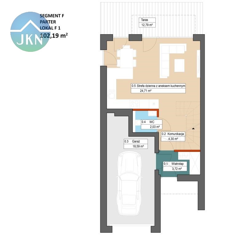 Dom w „segmencie F” posiada: własną niezależną działkę (stanowiącą odrębną nieruchomość z własną księgą wieczystą) wbudowany garaż jednostanowiskowy, oraz balkon.