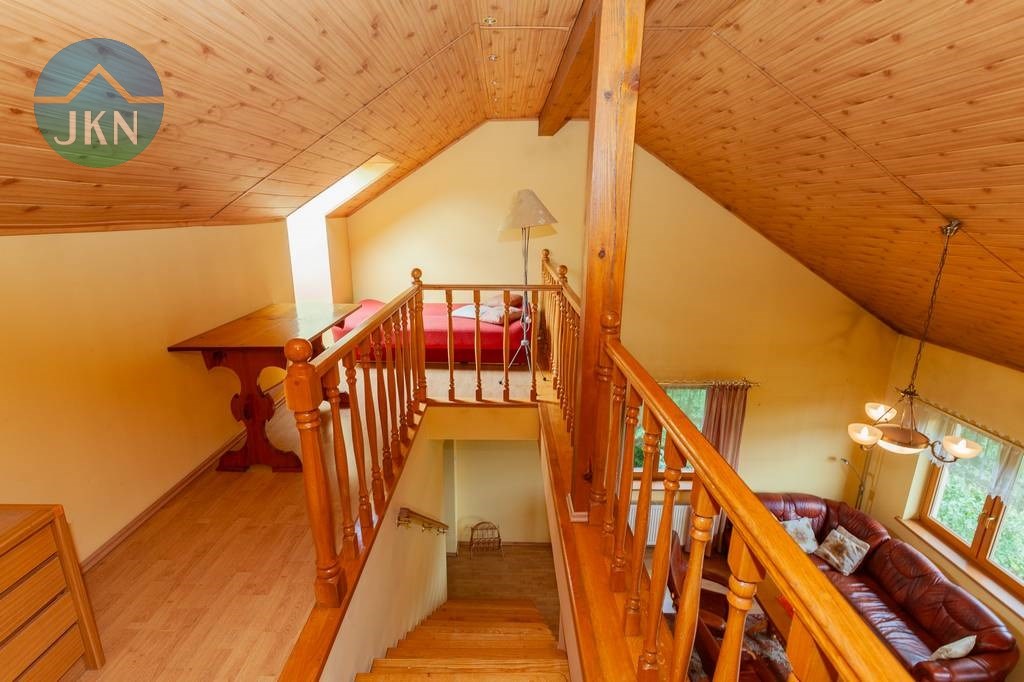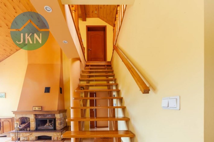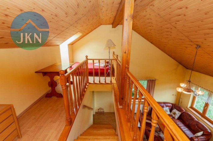 Centralne miejsce w domu stanowi pokój dzienny otwarty pod dach z kominkiem i dużym balkonem. Jest to idealne miejsce spotkań rodzinnych i towarzyskich. Dodatkowo na parterze masz do dyspozycji ładną sypialnię z widokiem na Jezioro Żywieckie, gabinet, oddzielną kuchnię połączoną z pokojem dziennym i dużą łazienkę. Po wyjściu na antresolę możesz rozmawiać z gośćmi patrząc na cały pokój dzienny z góry. Do antresoli przylega dodatkowa sypialnia z pięknymi widokami przez okna dachowe. W piwnicy mamy kotłownię z kuchnią letnią i pomieszczenie gospodarcze, które może być przeznaczone na hobby.