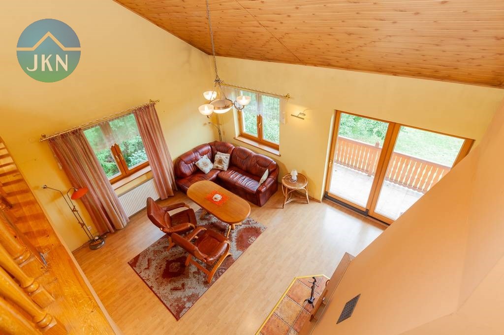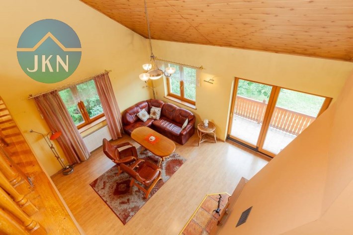 - Pokój dzienny z wysokim sufitem do 5,36 m wyposażony w kominek z wyjściem na duży balkon z widokiem na Jezioro Żywieckie
