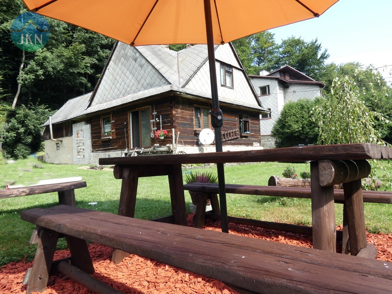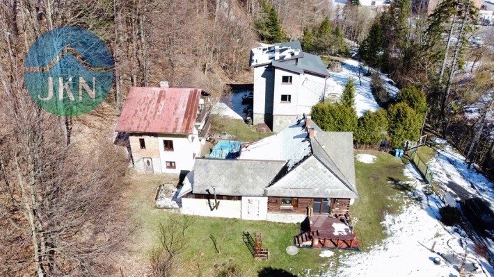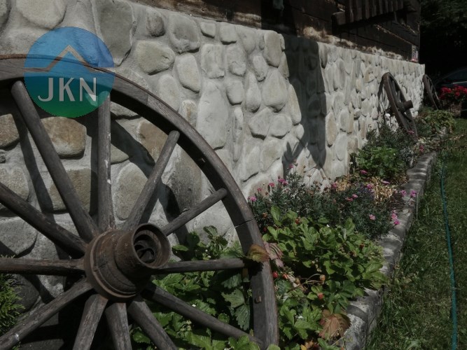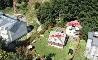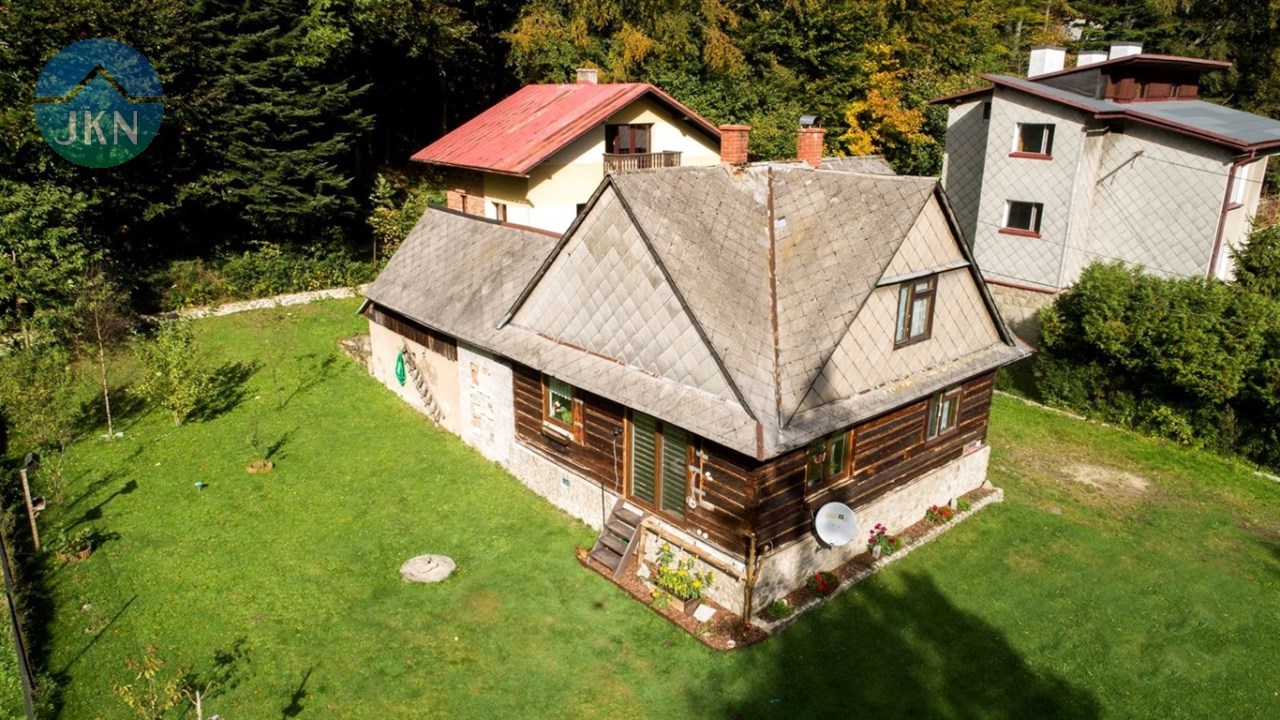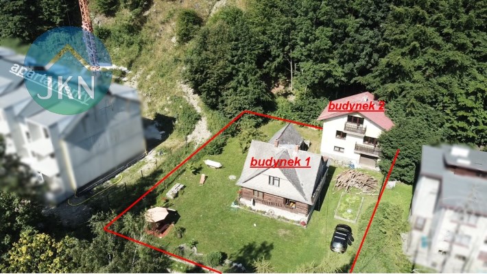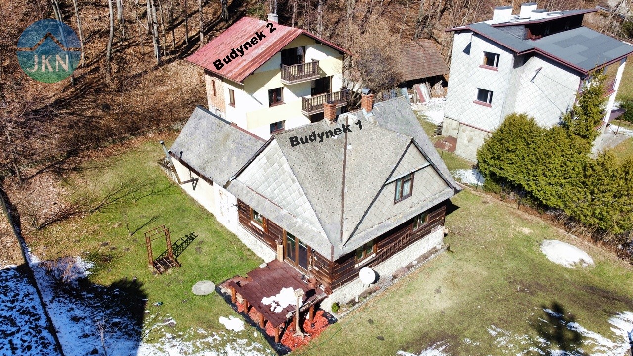 - Dwa budynki mieszkalne na ogrodzonej, dziewięcioarowej działce (916 m²), otoczonej zielenią, z przepływającą poniżej górską rzeką.