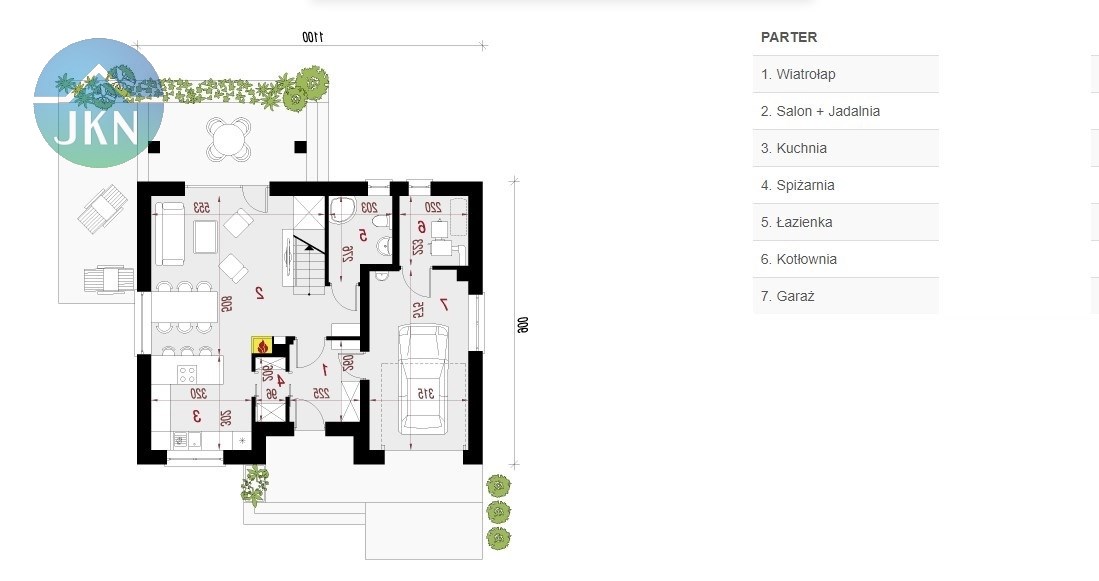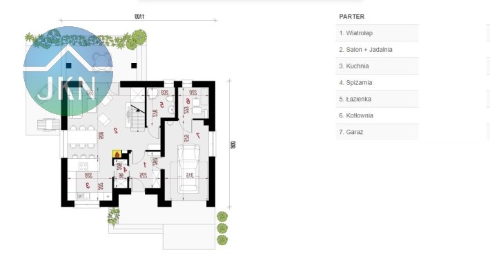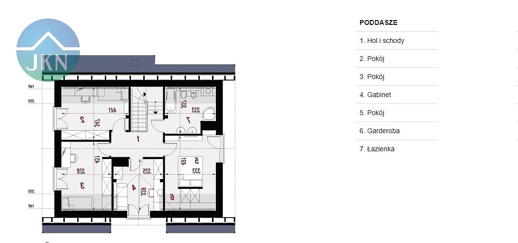 ROZKŁAD: PARTER: wiatrołap, salon z wyjściem na taras połączony z jadalnią i z kuchnią, spiżarnia, łazienka, kotłownia, garaż; PIĘTRO PODDASZOWE: hol, 3 sypialnie, gabinet, garderoba ( w jednej sypialni), łazienka.