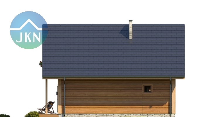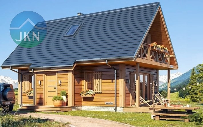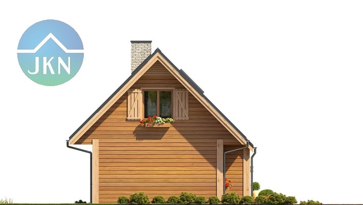Dom jest zaprojektowany w konstrukcji szkieletowej drewnianej. Ma prostą bryłę zorganizowaną na planie prostokąta. Całość przykryta jest dachem dwuspadowym o kącie nachylenia 45 stopni. Projekt uwzględnia zadaszony taras i balkon wsparty na słupach. Będzie to doskonałe miejsce wypoczynku. Estetyczna bryła dobrze się prezentuje w wiejskim krajobrazie. Ozdobą domu są okiennice oraz drewniane elementy architektoniczne.
