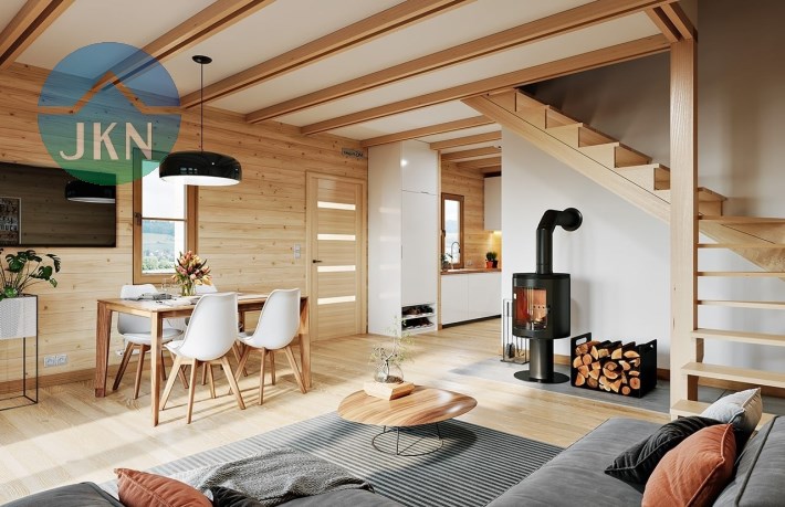 Funkcjonalny kominek i drewniane schody w salonie stanowią element dekoracyjny wnętrza. Z salonu też wyjdziemy bezpośrednio na taras oraz ogród.