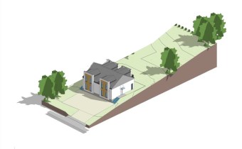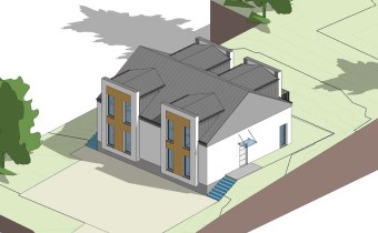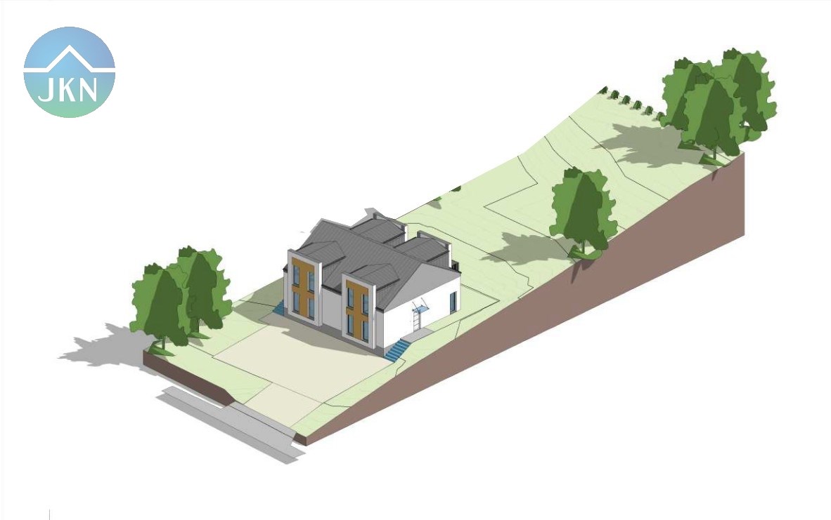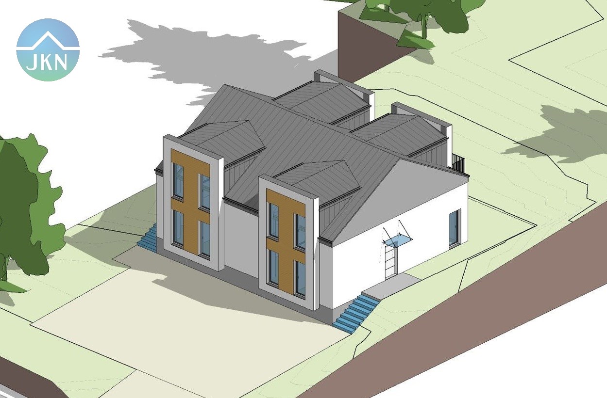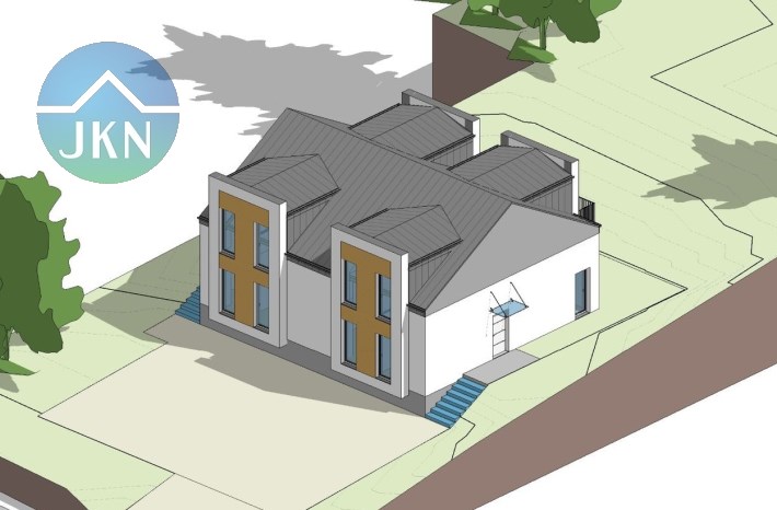 DZIAŁKA A: pow. ok. 0,1392 ha, cena 450,00 zł brutto/1 mkw. (w tym VAT) – projekt budynku jednorodzinnego w zabudowie dwulokalowej wg. indywidualnego projektu pracowni ARCHIKOS