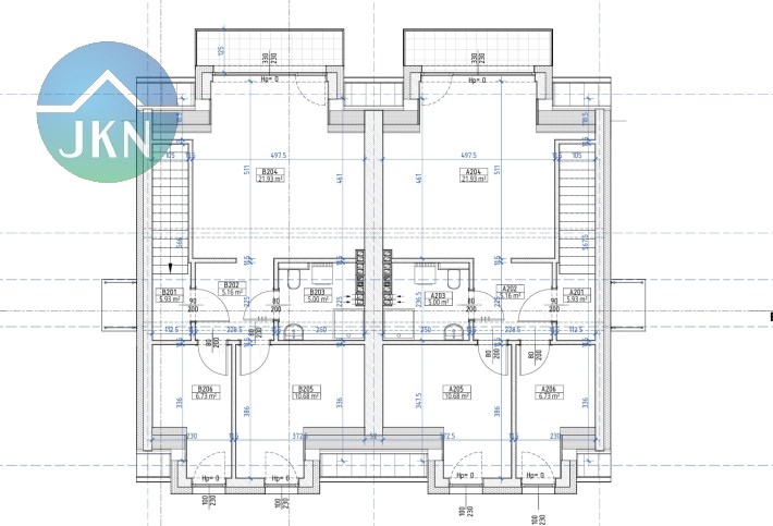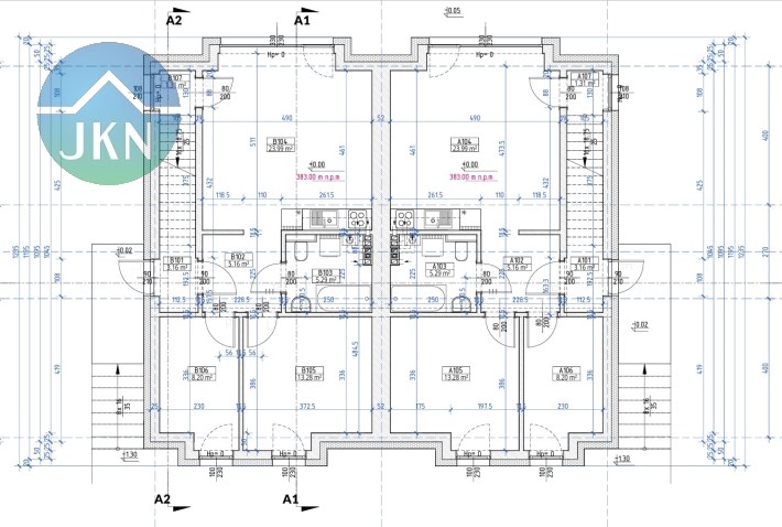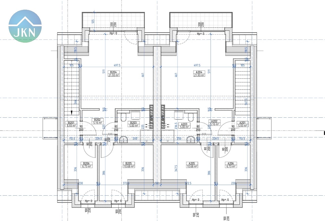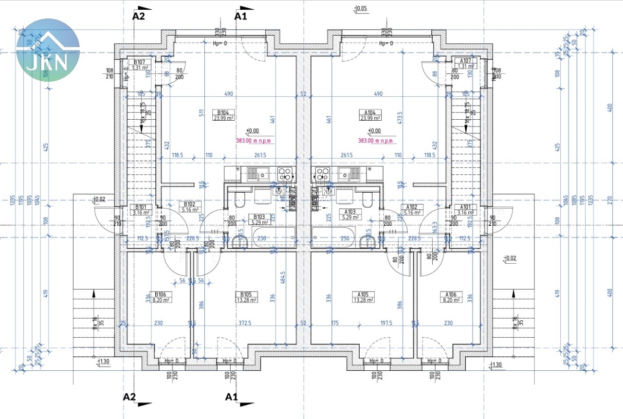 Działka sprzedawana z pozwoleniem na budowę budynku jednorodzinnego dwulokalowego wg. projektu z pracowni architektonicznej ARCHIKOS o łącznej pow. użytkowej 231,64 m2, (2 x lokal mieszkalny o pow. 115,82m2) i rozkładzie pomieszczeń: