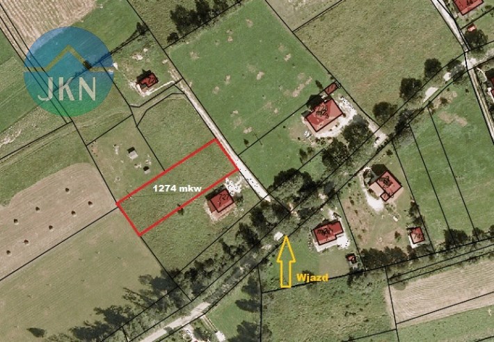 Widokowa działka budowlana o powierzchni 1274 m2 kształtem zbliżona do prostokąta o wymiarach 63m x 20m.