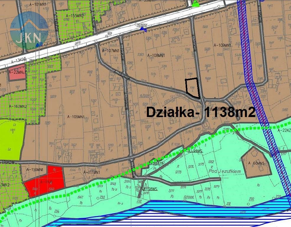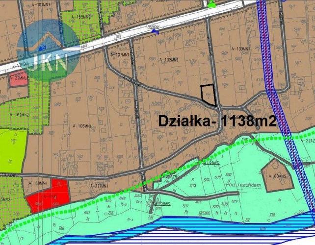 W Miejscowym Planie Zagospodarowania Przesterzennego oznaczona jest symbole MN1 co oznacza tereny zabudowy mieszkaniowej z dopuszczeniem usług nieuciążliwych (do 50%).
