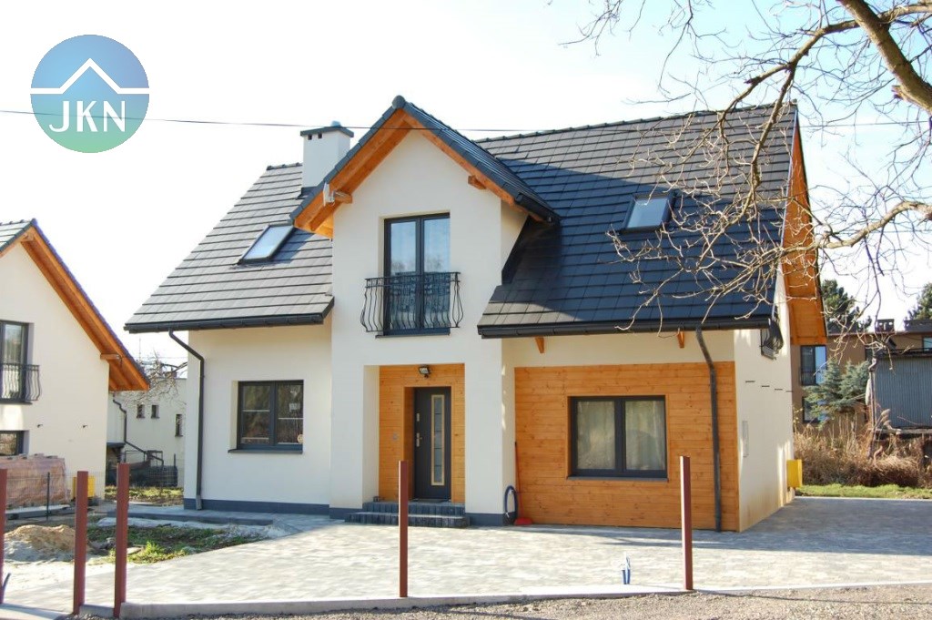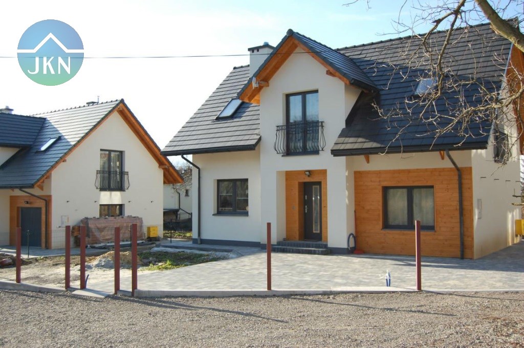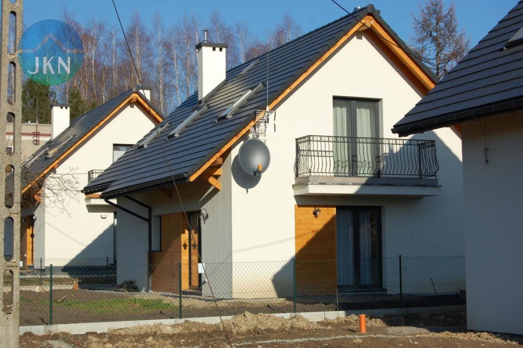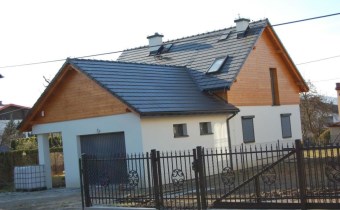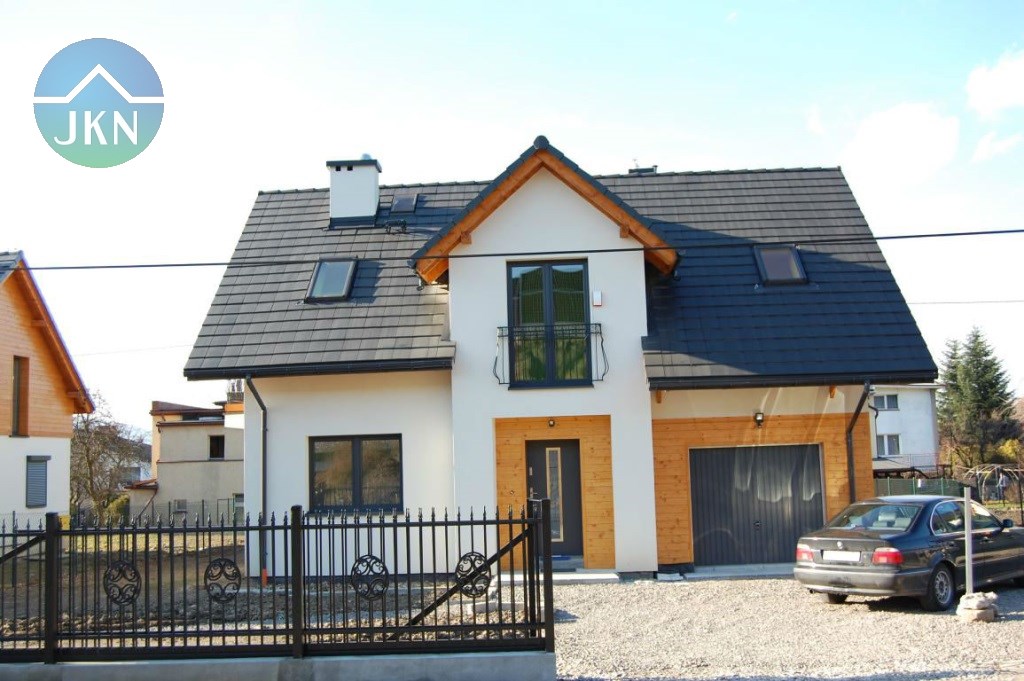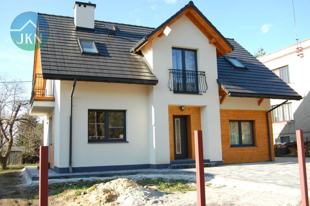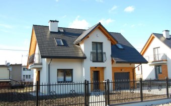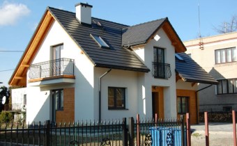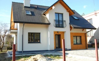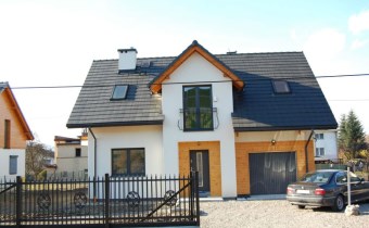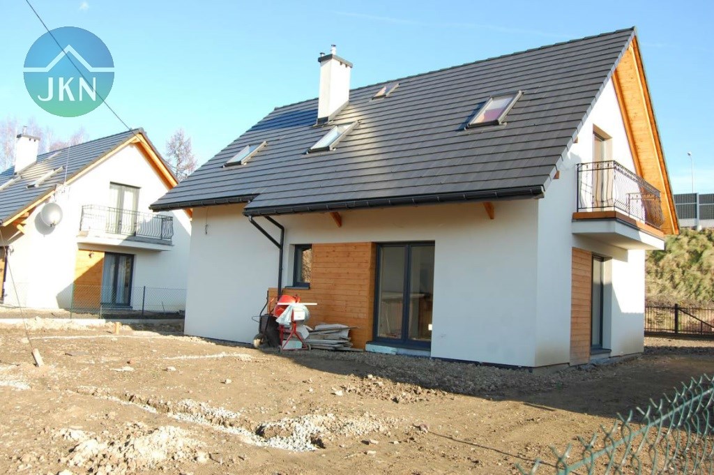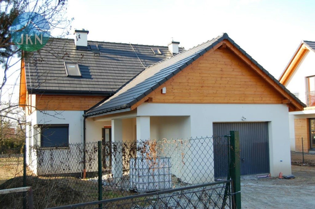 z elementami elewacji drewnianej. Dach dwuspadowy z nachyleniem 40° i 35°, pokryty dachówką betonową BRAAS. Orynnowanie PCV. ominy systemowe nad dachem otynkowane i ocieplone. Okna PCV. Drzwi zewnętrzne ocieplone. Brama garażowa uchylna. Schody żelbetowe. Wykonane przyłącza: wody miejskiej, kanalizacji (oczyszczalnia ekologiczna), gazu i prądu. Dach ocieplony wełną mineralną oraz płytą GK. Piec c.o. Kaloryfery. Ściany wewnętrzne pokryte tynkiem cementowo-wapiennym. Podłogi: wylewka cementowa. Wewnątrz rozprowadzona instalacja elektryczna (bez białego montażu), wodno-kanalizacyjna, gazowa oraz grzewcza.