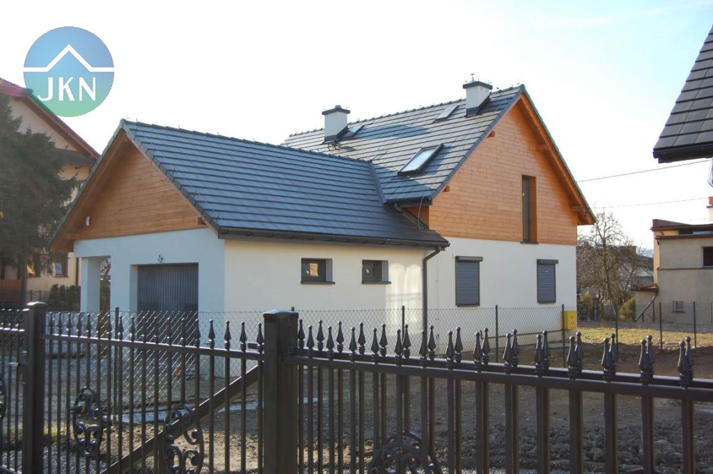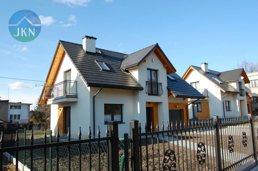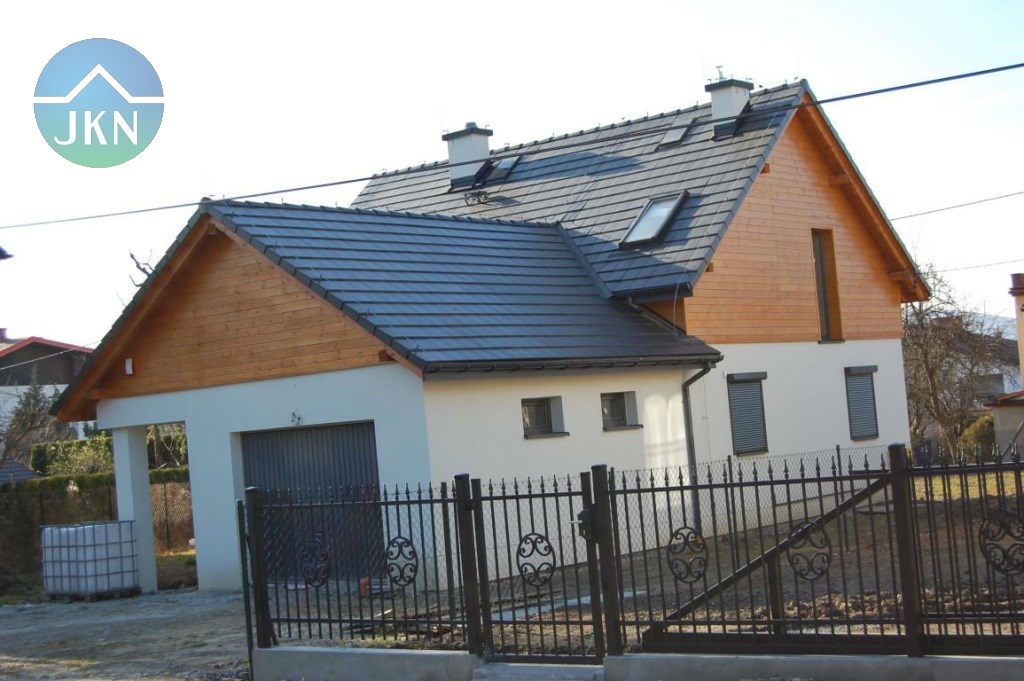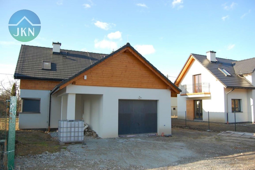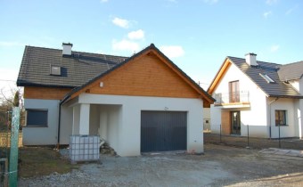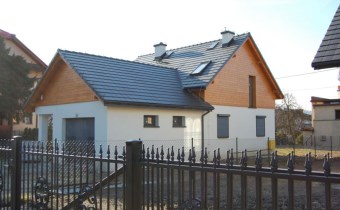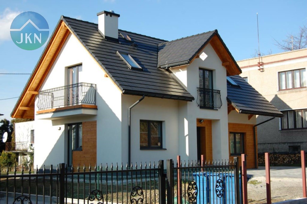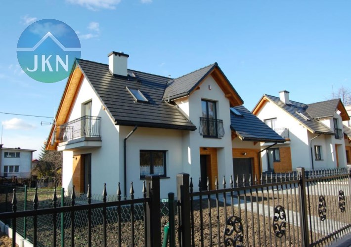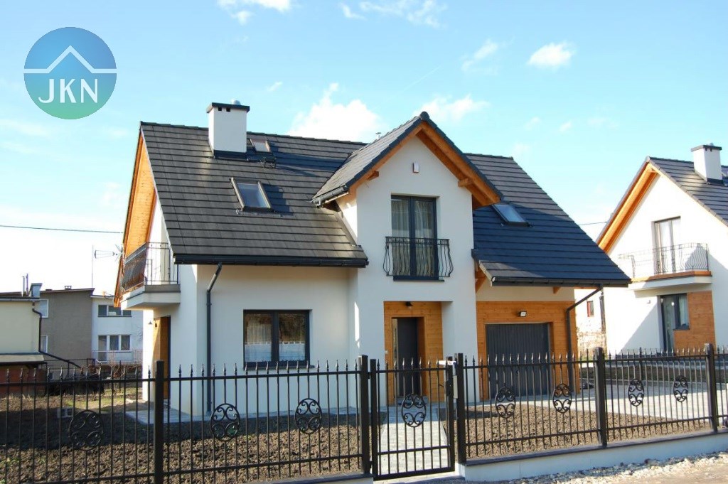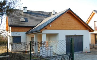 z elementami elewacji drewnianej. Dach dwuspadowy z nachyleniem 40° i 35°, pokryty dachówką betonową BRAAS. Orynnowanie PCV. ominy systemowe nad dachem otynkowane i ocieplone. Okna PCV. Drzwi zewnętrzne ocieplone. Brama garażowa uchylna. Schody żelbetowe. Wykonane przyłącza: wody miejskiej, kanalizacji (oczyszczalnia ekologiczna), gazu i prądu. Dach ocieplony wełną mineralną oraz płytą GK. Piec c.o. Kaloryfery. Ściany wewnętrzne pokryte tynkiem cementowo-wapiennym. Podłogi: wylewka cementowa. Wewnątrz rozprowadzona instalacja elektryczna (bez białego montażu), wodno-kanalizacyjna, gazowa oraz grzewcza.