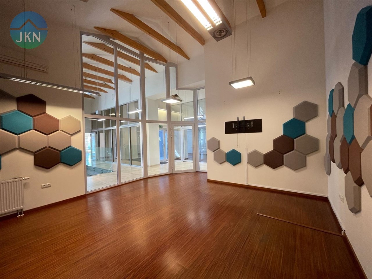 Lokal zajmuje drugie i trzecie piętro w czterokondygnacyjnym nowoczesnym budynku przy ul. Partyzantów. Wnętrze lokalu zostało zaprojektowane z myślą o funkcjonalności i komforcie pracy. Przestrzeń została podzielona szkłem, a obie kondygnacje łączą efektowne szklane schody. Przeszklone pomieszczenia dedykowane pod biura, sale konferencyjne - zarówno mniejsze jak i większe, sala rekreacyjna, taras. Dodatkowo dla wygody użytkowników lokal wyposażony jest w dwie kuchnie oraz elegancko wykończone toalety na obu piętrach, a także w serwerownię. Przestrzeń, która inspiruje do pracy! Przeszklenia pomieszczeń łączą nowoczesny design z przestronnością. Lokal pomimo upływu czasu, nadal robi duże wrażenie!