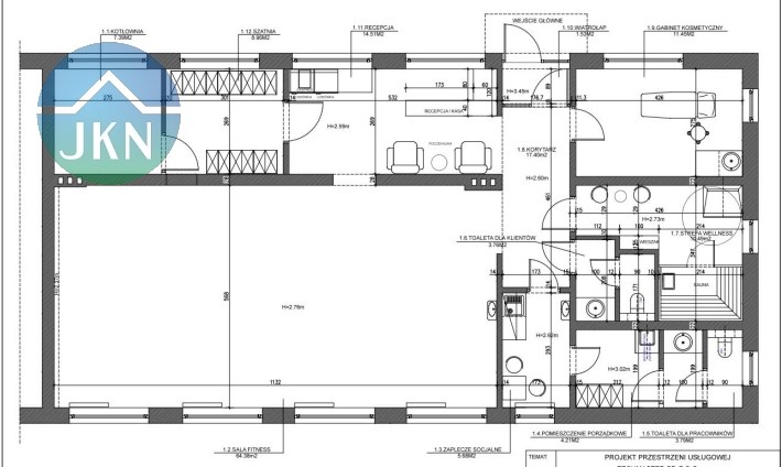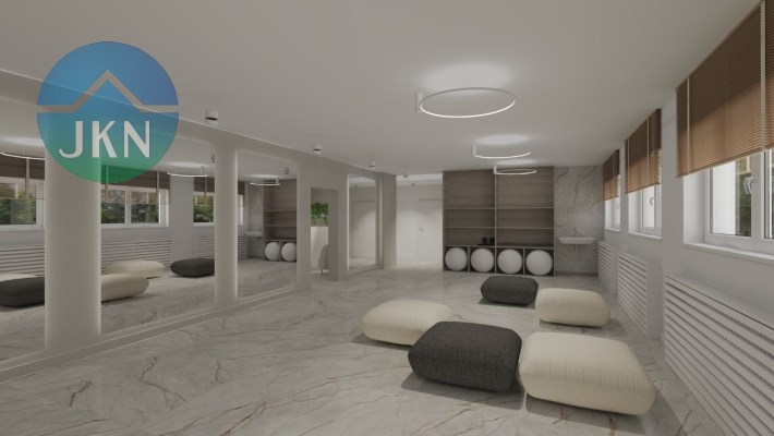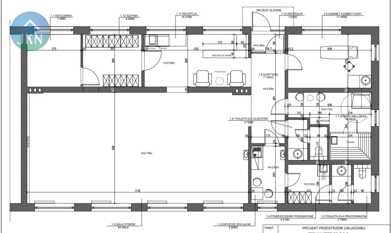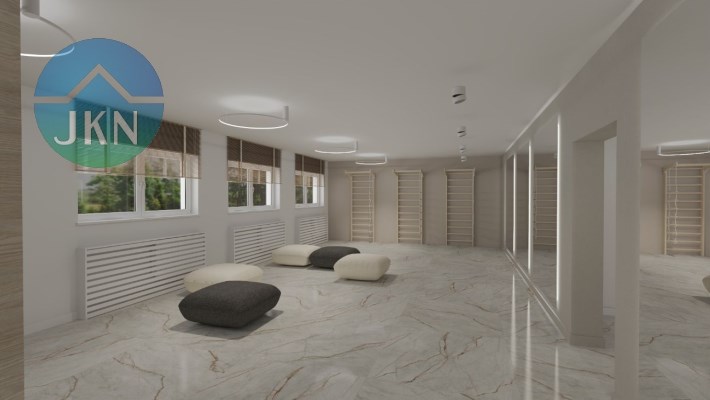 ROZKŁAD (przykładowe możliwości wykorzystania): sala np. fitness 64,38 m2, zaplecze socjalne 5,68 m2, pomieszczenie porządkowe 4,21 m2, toaleta dla pracowników 3,79 m2, toaleta dla klientów 3,76 m2, strefa wellness z np. sauną 10,45 m2, gabinet kosmetyczny 11,45 m2, korytarz 17,40 m2, wiatrołap 1,53 m2, recepcja 14,51 m2, szatnia 8,96 m2 (przygotowana na 15 szafek), kotłownia 7,39 m2