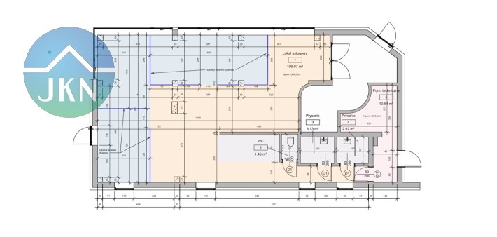 - wejście do lokalu / recepcja / poczekalnia / 3 wydzielone przeszkleniami pomieszczenia biurowe/ usługowe (o pow. 20,54 mkw., 13,48 mkw., 13,48 mkw.) o łącznej pow. 109,07 mkw.