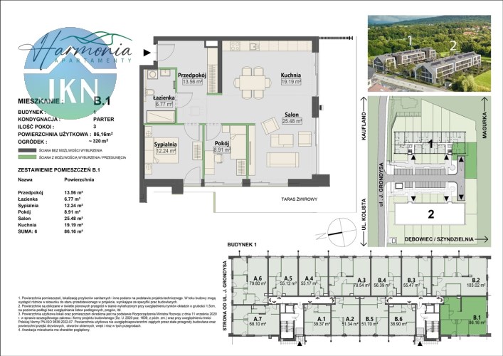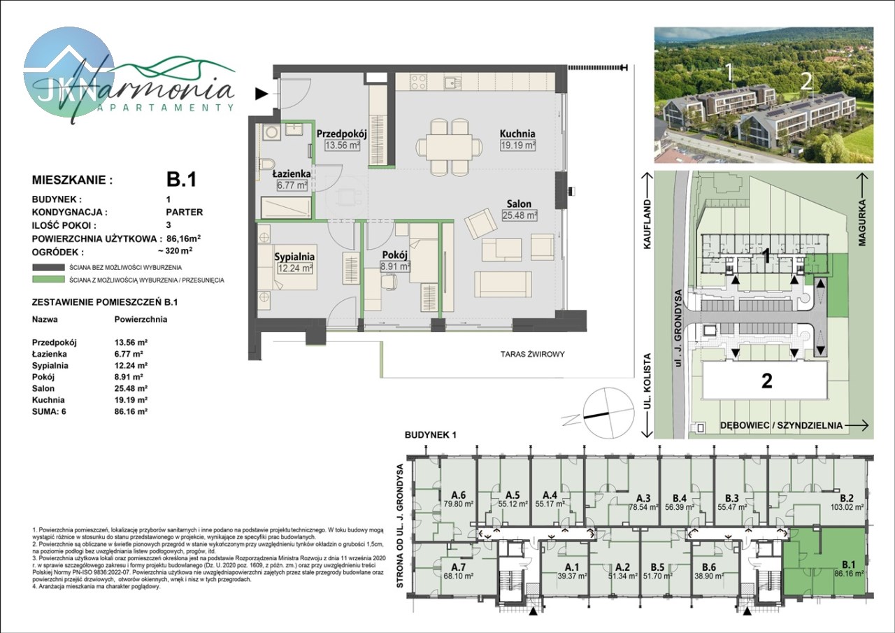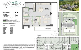 Oferowany lokal mieszkalny nr B.1 o pow. 86,16 mkw., z własnym ogródkiem o pow. ok. 320 mkw. oraz wystawą okien w kierunku południowo - zachodnim, zlokalizowany jest na parterze budynku nr 1.