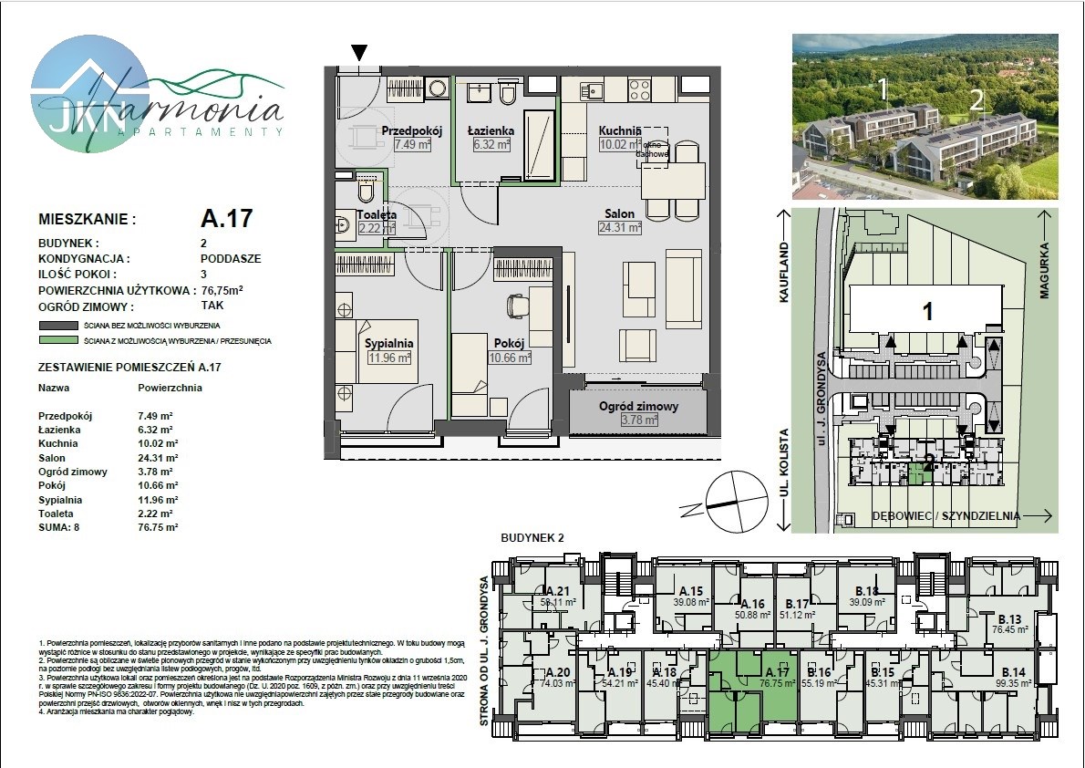3 - pokojowy lokal mieszkalny nr A.17 o pow. 76,75 mkw., z wystawą okien w kierunku zachodnim, zlokalizowany na 2 piętrze (poddaszu) budynku nr 2.