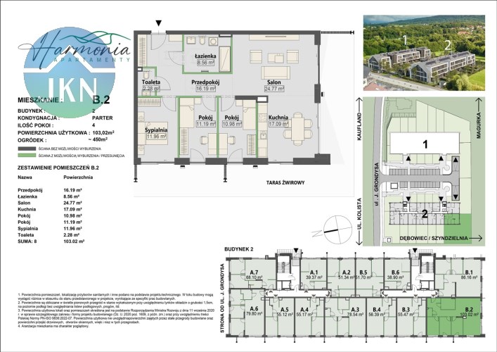 Oferowany lokal mieszkalny nr B.2 o pow. 103,02 mkw., z własnym ogródkiem o pow. ok. 450 mkw. oraz wystawą okien w kierunku południowo - zachodnim, zlokalizowany jest na parterze budynku nr 2.
