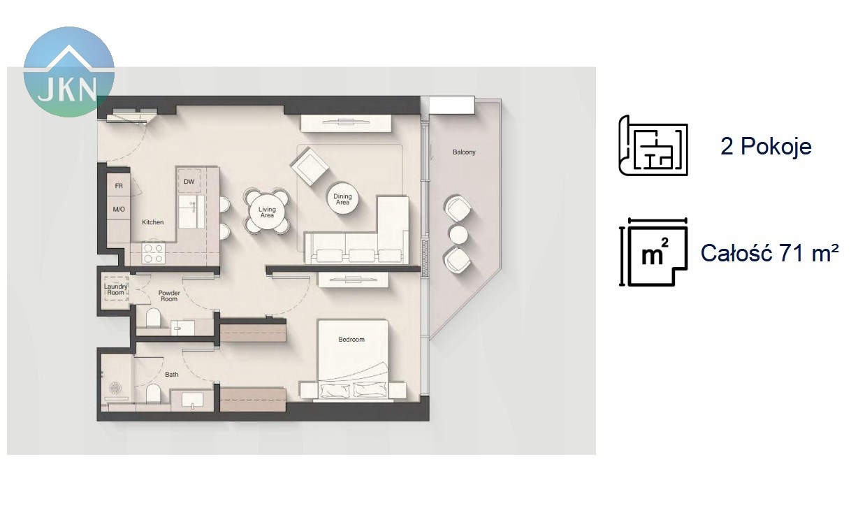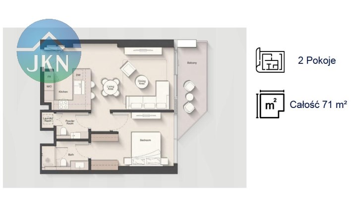 - salon z aneksem kuchennym z wyjściem na balkon, sypialnia z prywatną łazienką, łazienka dla gości z pralnią