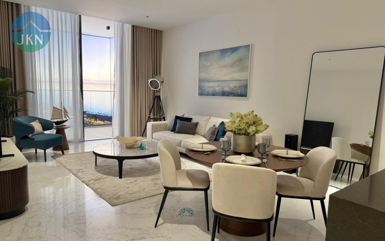 Prezentowany apartament typu 1 Bedroom (2 pokoje) ma powierzchnię ok. 64 m² oraz balkon o powierzchni ok. 7 m², co łącznie daje około 71 m² przestrzeni. Cena zaczyna się od 1 710 888 AED, czyli około 1 692 352 zł, a termin oddania inwestycji przewidziany jest na IV kwartał 2028 roku.