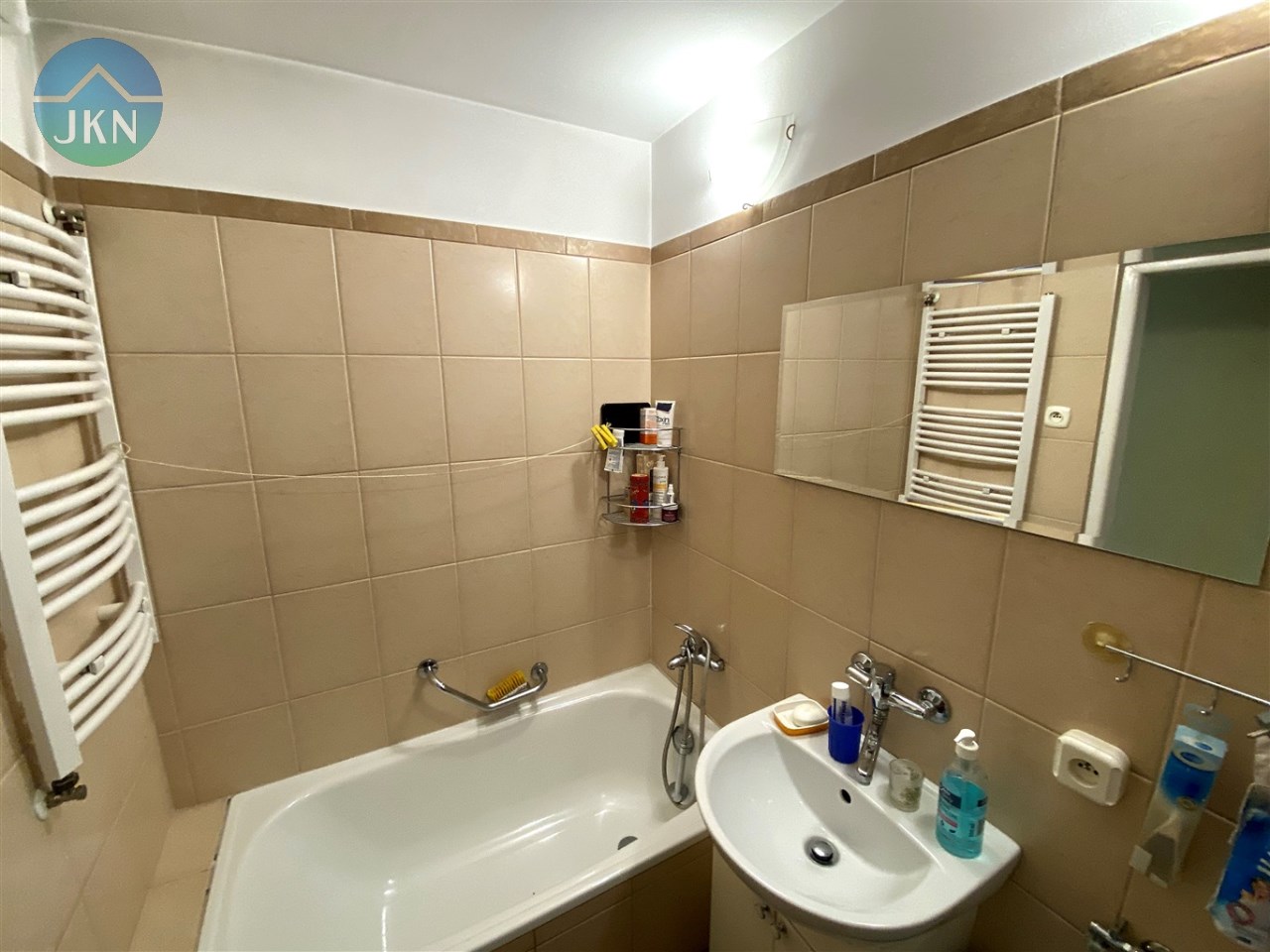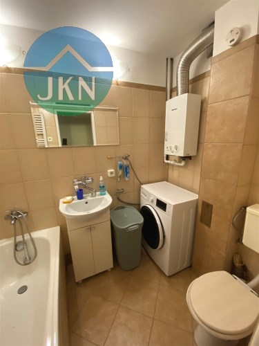 - łazienka z wc - kafelki, wanna, umywalka w zabudowie, wc, pralka, łazienkowy piecyk gazowy,