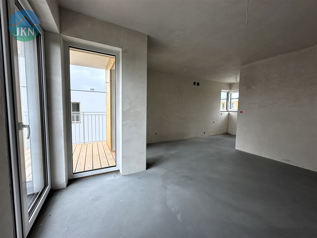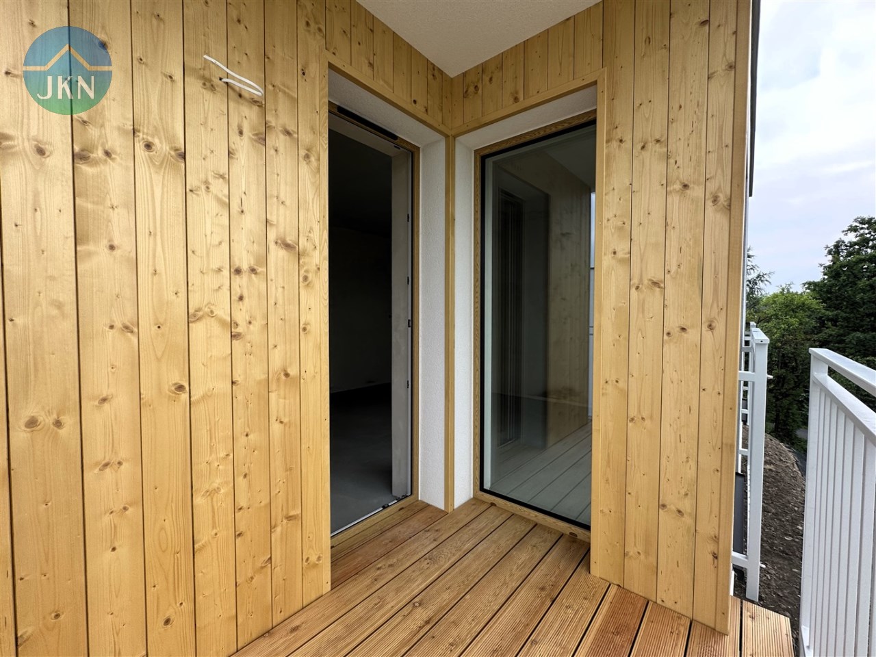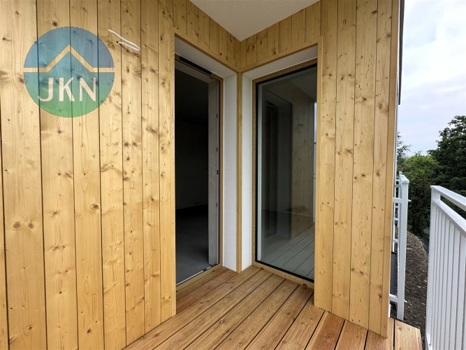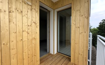 - Balkon – barierka stalowa, wypełniona płaskownikami stalowymi; na posadzce ryflowane drewniane deski tarasowe;