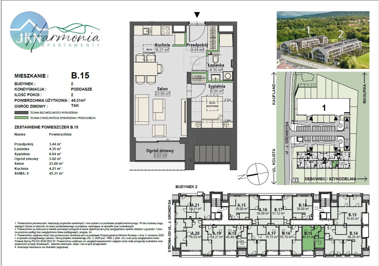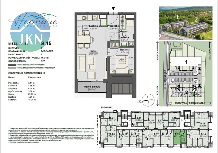 Oferowany lokal mieszkalny nr B.15 o pow. 45,31 mkw., z ogrodem zimowym oraz wystawą okien - strona zachodnia, zlokalizowany jest na 2 pietrze (poddaszu) budynku nr 2
