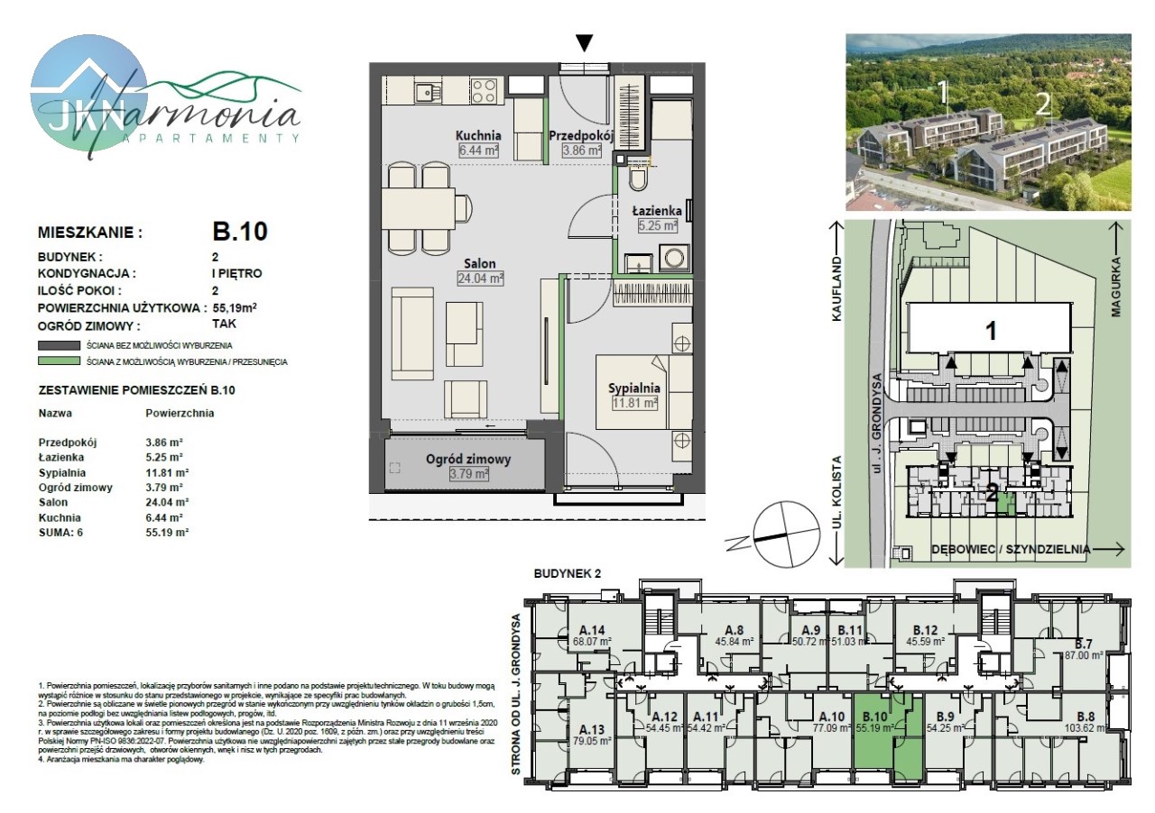 Oferowany lokal mieszkalny nr B.10 o pow. 55,19 mkw., z ogrodem zimowym oraz wystawą okien - strona zachodnia, zlokalizowany jest na 1 pietrze budynku nr 2