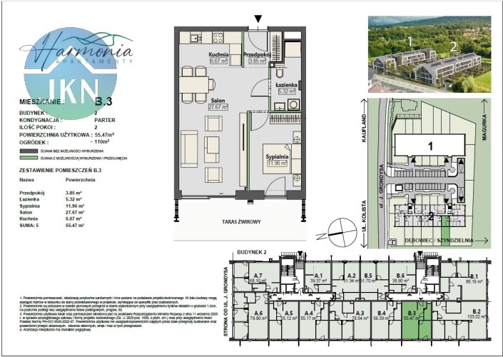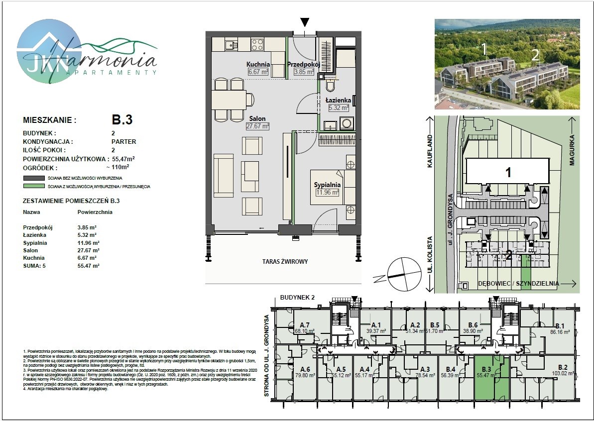 Oferowany lokal mieszkalny nr B.3 o pow. 55,47 mkw., z własnym ogródkiem o pow. ok. 110 mkw. oraz wystawą okien w kierunku południowo - zachodnim, zlokalizowany jest na parterze budynku nr 2.