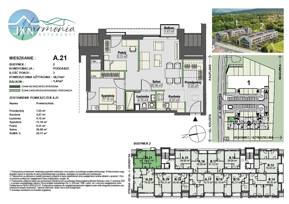 Oferowany 3 - pokojowy lokal mieszkalny nr A.21 o pow. 58,11 mkw., oraz wystawą okien w kierunku północno-wschodnim, zlokalizowany jest na drugim piętrze (poddasze) budynku nr 2.