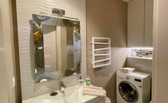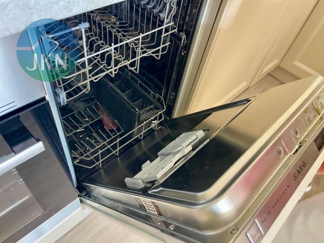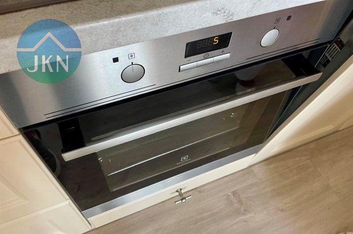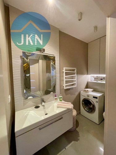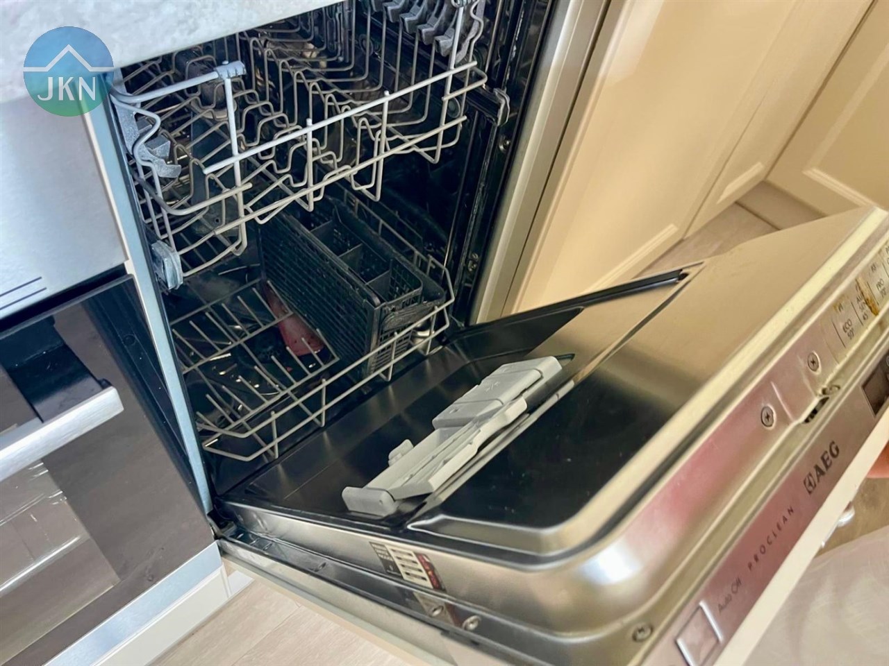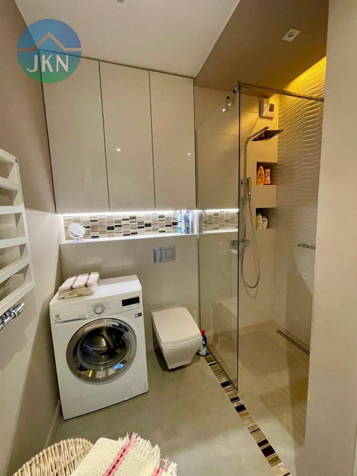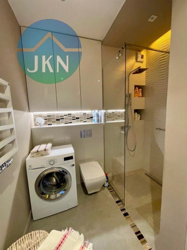 - kuchnia w zabudowie z niezbędnymi sprzętami AGD: lodówka, płyta indukcyjna 4 palnikowa, zmywarka, piekarnik oraz mikrofalówka, w łazience pralka
