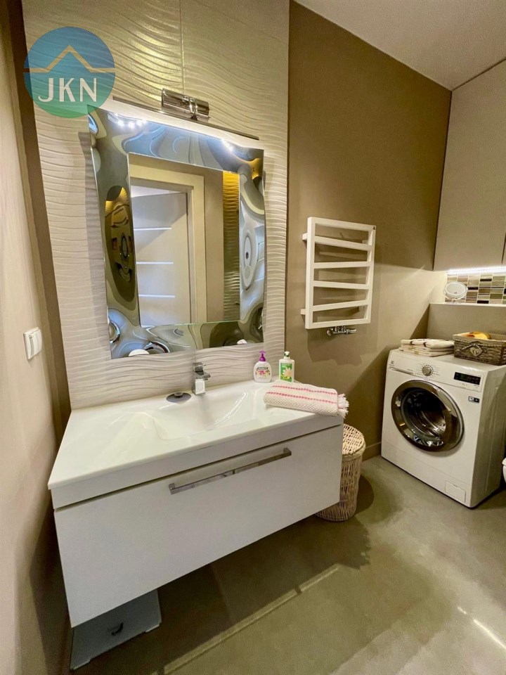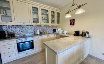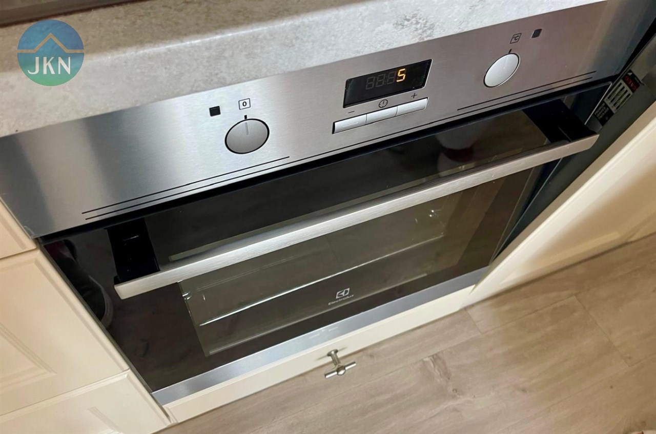 - kuchnia w zabudowie z niezbędnymi sprzętami AGD: lodówka, płyta indukcyjna 4 palnikowa, zmywarka, piekarnik oraz mikrofalówka, w łazience pralka